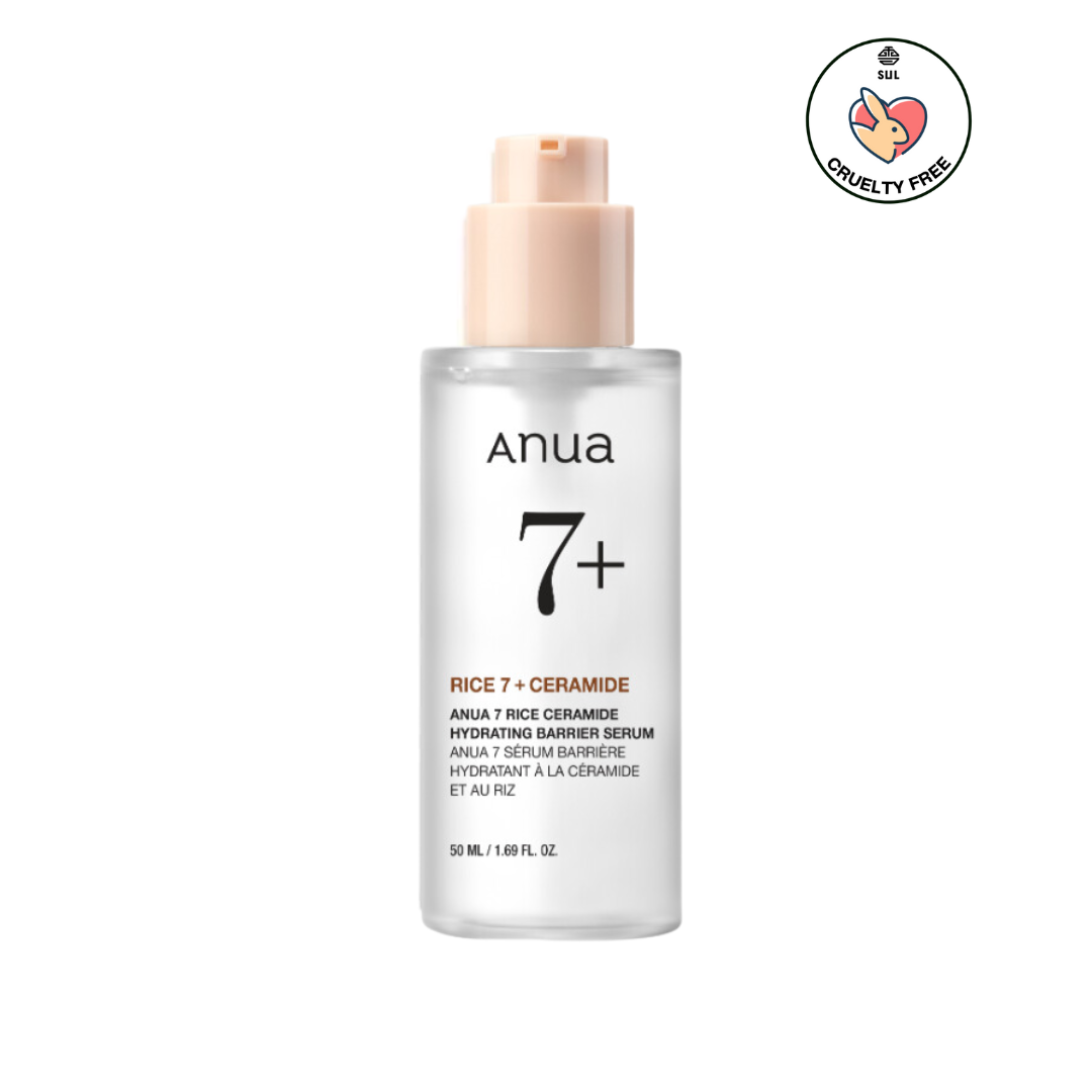 The 7 Rice Ceramide Hydrating Barrier Serum by Anua deeply hydrates and strengthens the skin barrier with the nourishing power of rice bran water, ceramides, and honey extract.