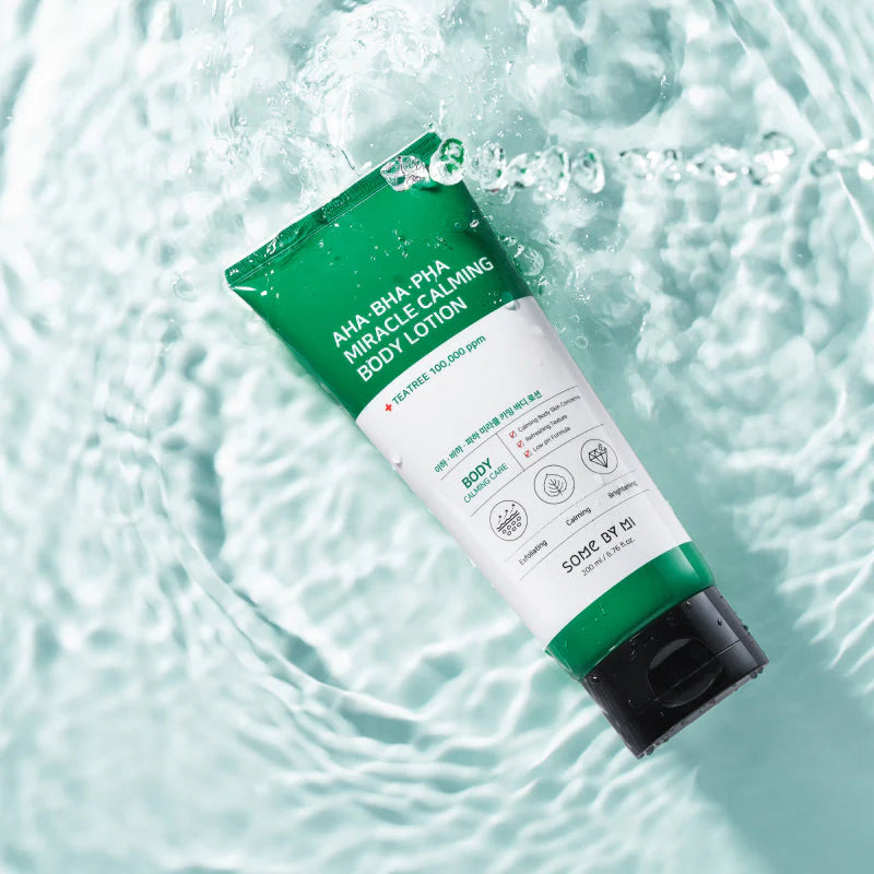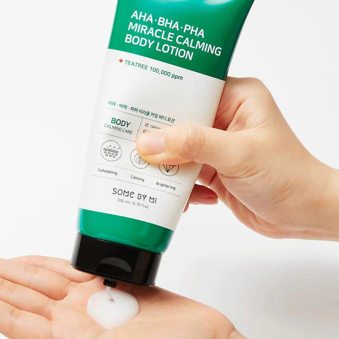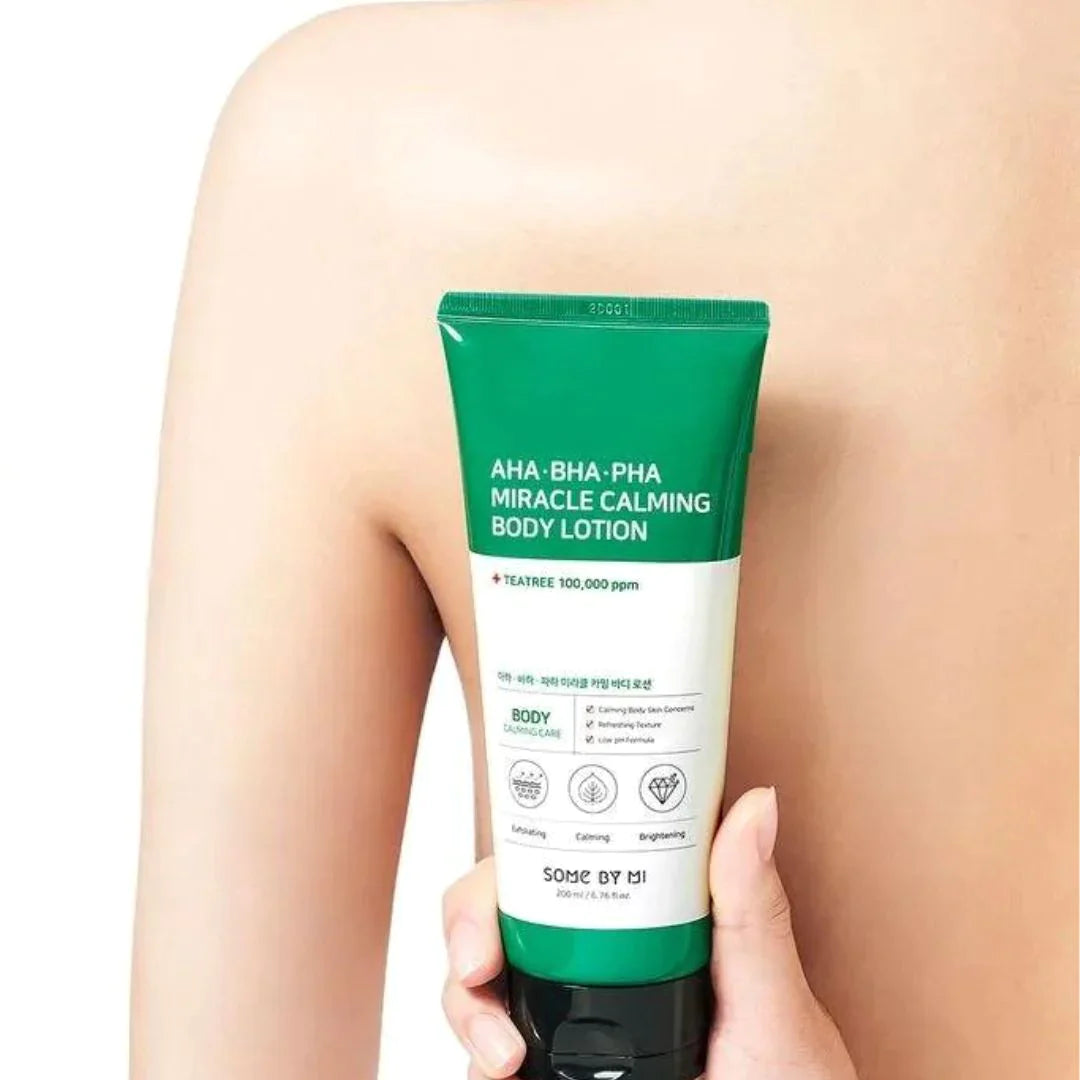 The AHA BHA PHA Miracle Calming Body Lotion by Some By Mi is a lightweight moisturizer that exfoliates dead skin cells and removes excess sebum with AHA, BHA, PHA, and LHA.