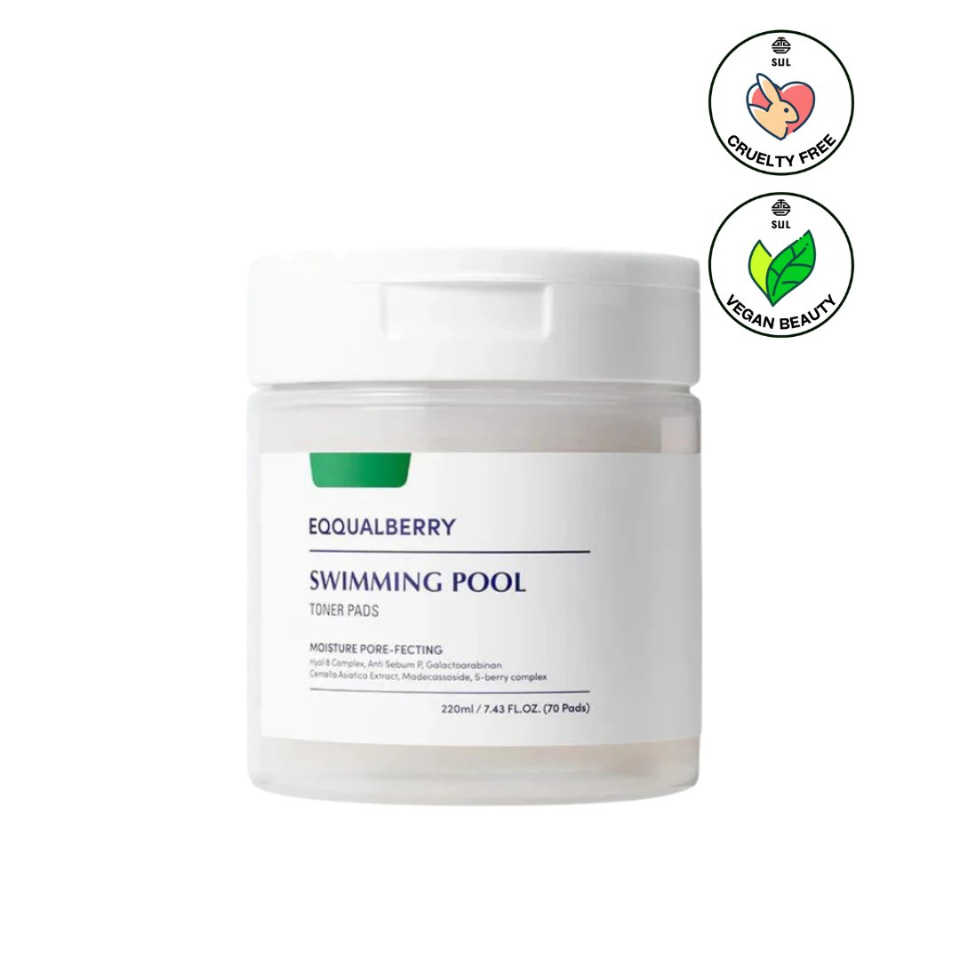 The Swimming Pool Daily Facial Toner by Eqqualberry are dual-sided hydrating and exfoliating pads infused with Hyal 8 Complex to boost moisture while gently removing impurities and dead skin cells.