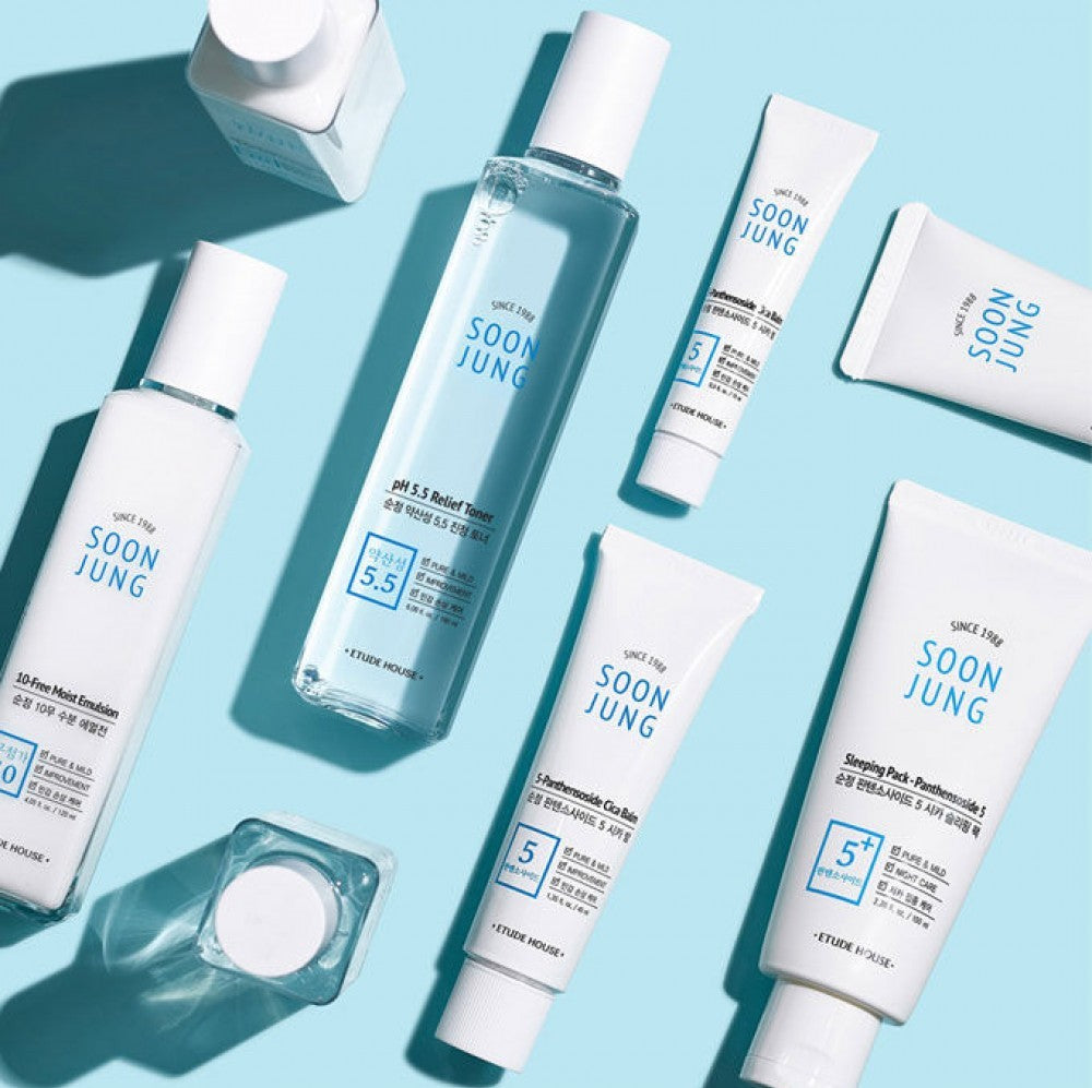 The Soon Jung Skin Care Set by Etude House is designed to offer relief to irritated, sensitive skin, providing essential moisture and purifying skin.