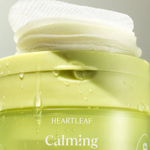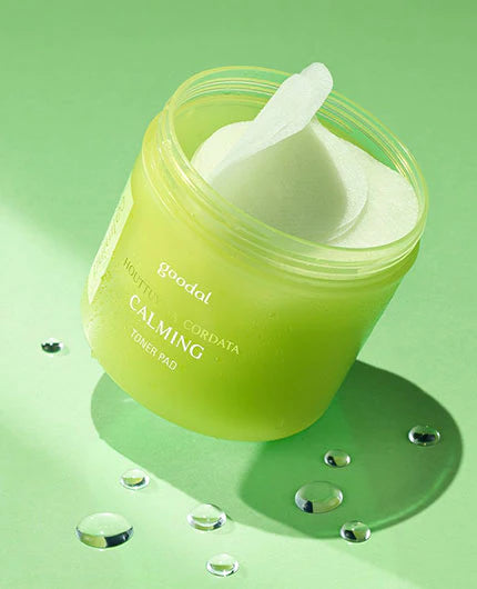 The Houttuynia Cordata (Heartleaf) Calming Toner Pad by Goodal are soaked in Jeju Houttuynia Cordata/Heartleaf extract, known for its anti-inflammatory and antioxidant properties, to soothe and moisturize skin.