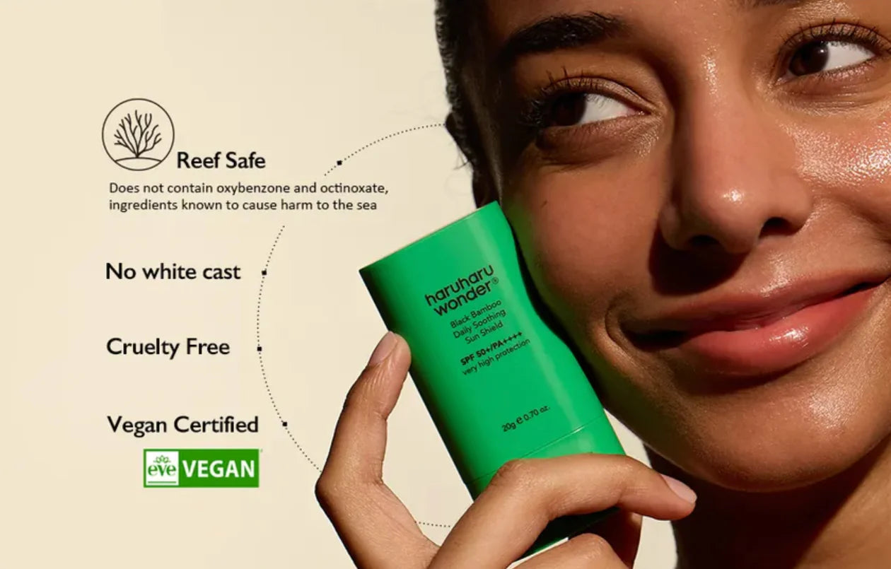 The Black Bamboo Daily Soothing Sun Shield by Haruharu Wonder provides SPF 50+ PA++++ protection in a convenient, swipeable stick, perfect for on-the-go application.