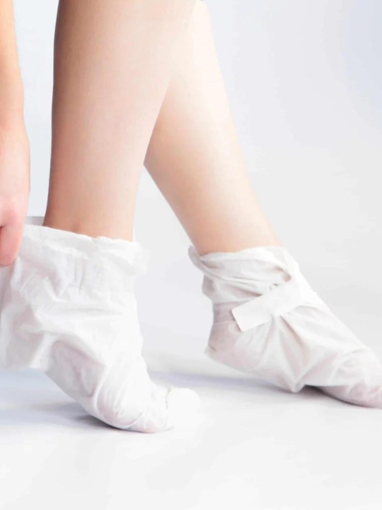 1. After washing your feet, open the pouch and take out foot mask. Wear the socks and seal them up. Wear the sock with “R” sticker on the right and “L” sticker on the left foot (Wrap the mask tightly around the ankles.)