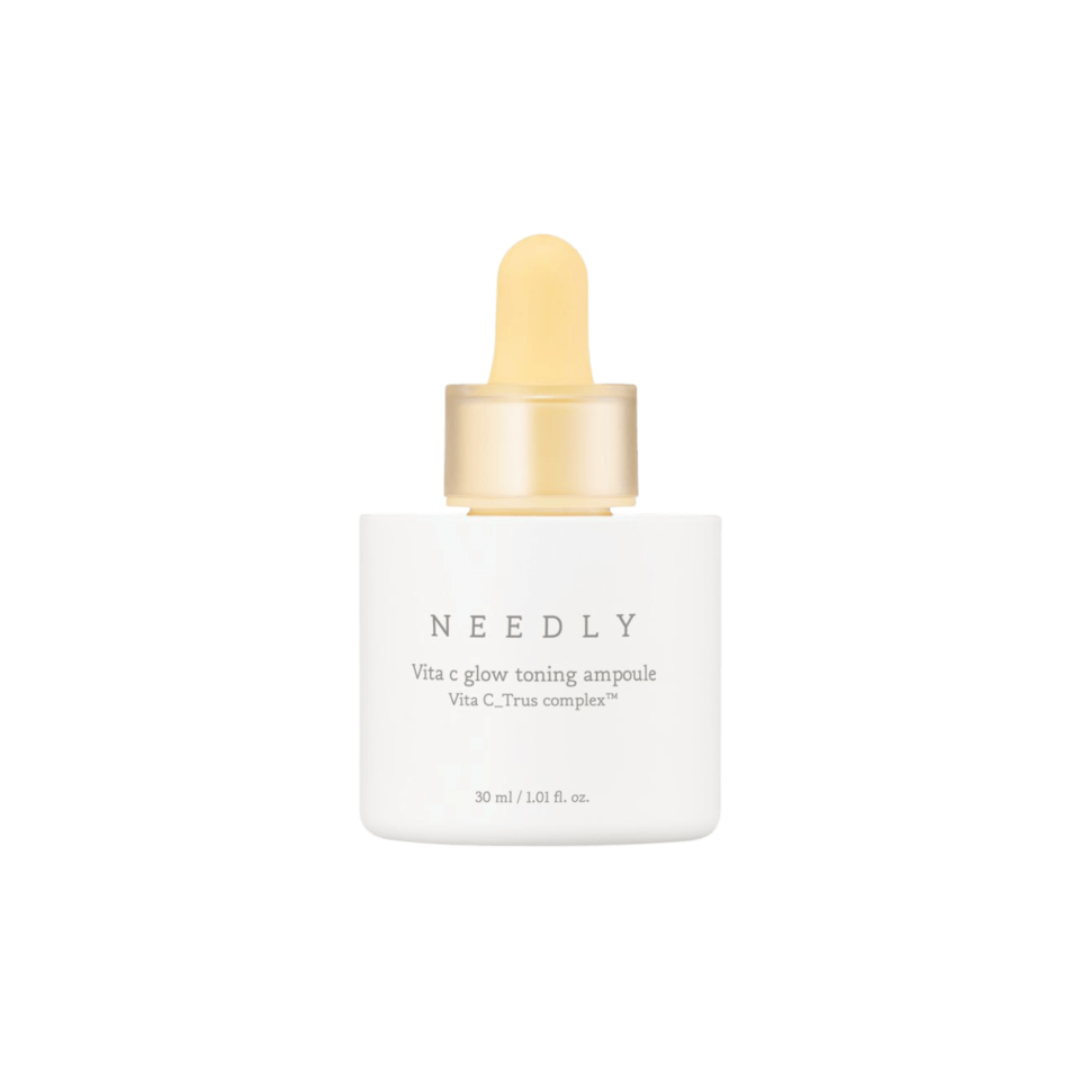 The Vita-C Glow Toning Ampoule by NEEDLY is a lightweight, hypoallergenic serum enriched with the Vita C_Trus complex and triple hyaluronic acids, designed to hydrate and brighten dull, tired skin. Its formula helps reduce pigmentation, improve skin tone, and increase elasticity while providing long-lasting moisture without any sticky residue. Ideal for revitalizing dry or blemished skin, this ampoule nourishes the skin for a smooth, radiant complexion with regular use.