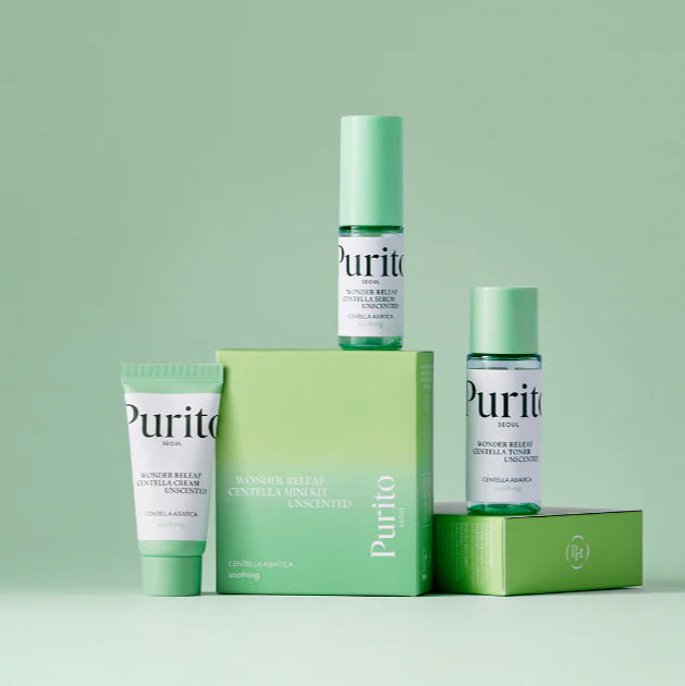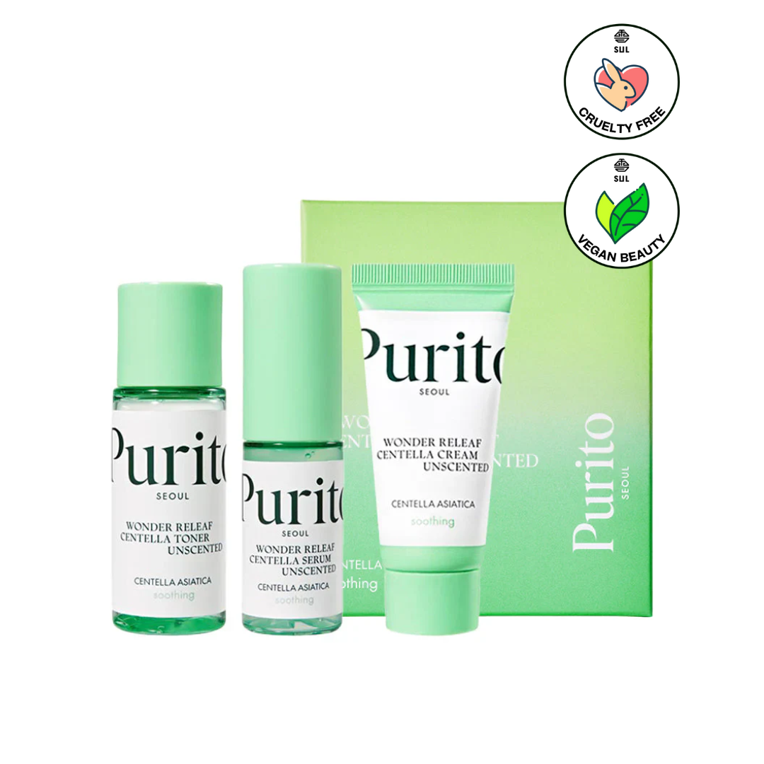 The Wonder Releaf Unscented Centella Mini Kit by Purito, is a curated set featuring travel-sized versions of their best-selling Centella Unscented line, designed to soothe and nourish sensitive skin.