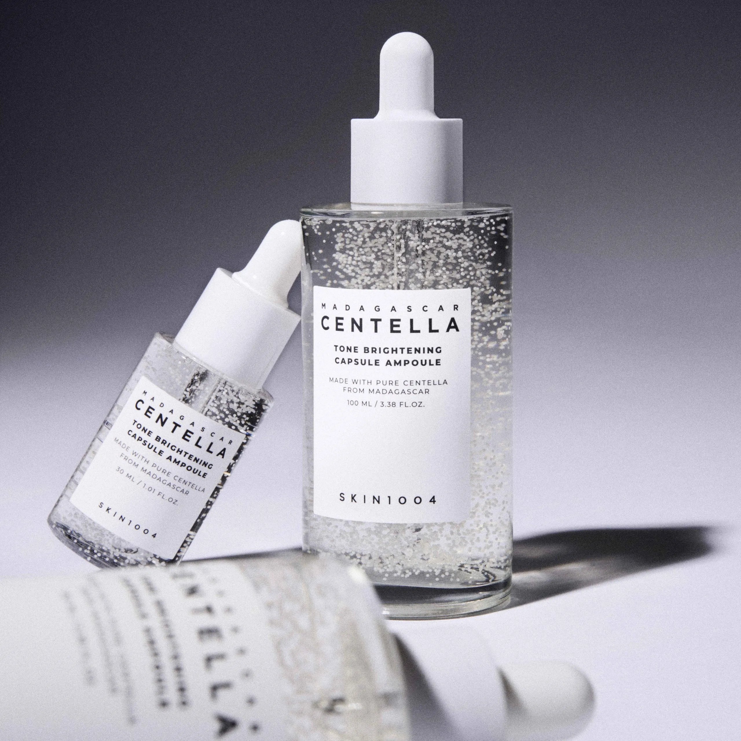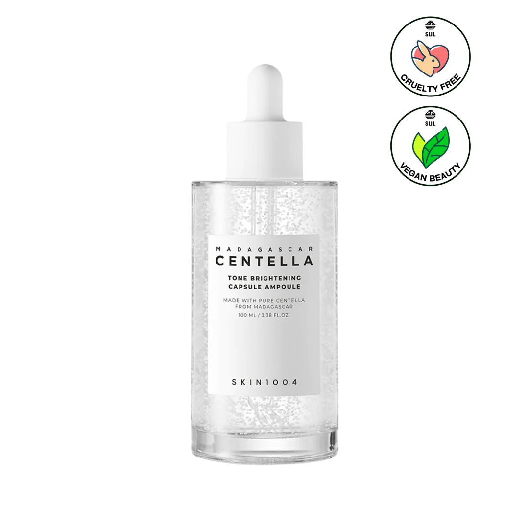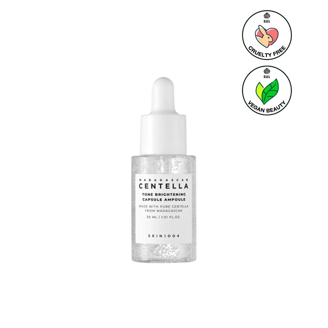 The Madagascar Centella Tone Brightening Capsule Ampoule by SKIN1004 is infused with 77% pure Centella asiatica extract, niacinamide, and potent botanicals like papaya and apple extracts, this fast-absorbing formula brightens dull skin, diminishes dark spots, and improves overall skin tone and texture. Perfect for achieving a luminous complexion, it effectively targets hyperpigmentation, scars, and fine lines, leaving your skin supple, balanced, and visibly brighter. complexion.