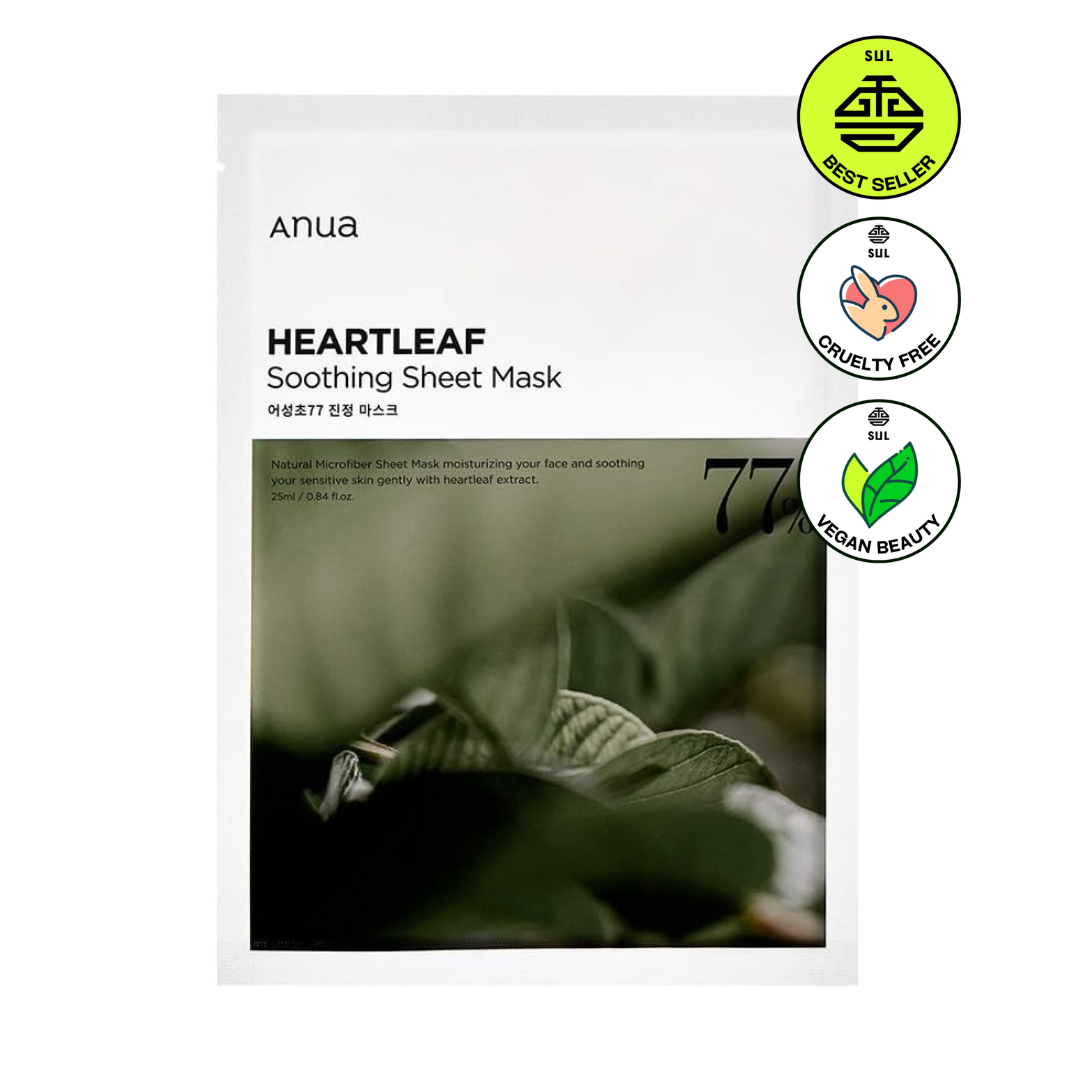 The Heartleaf 77% Soothing Sheet Mask by Anua is a hydrating lifesaver, featuring a potent blend of 77% Houttuynia Cordata Extract to calm sensitive skin and shield it from environmental stressors.