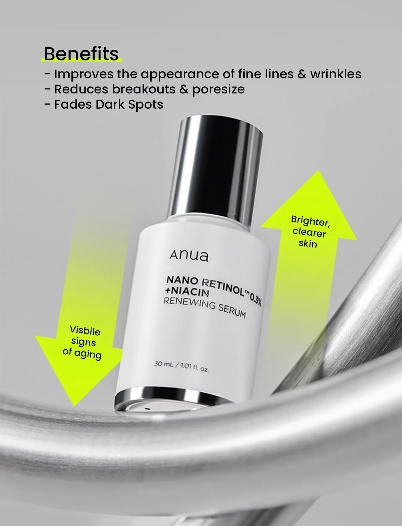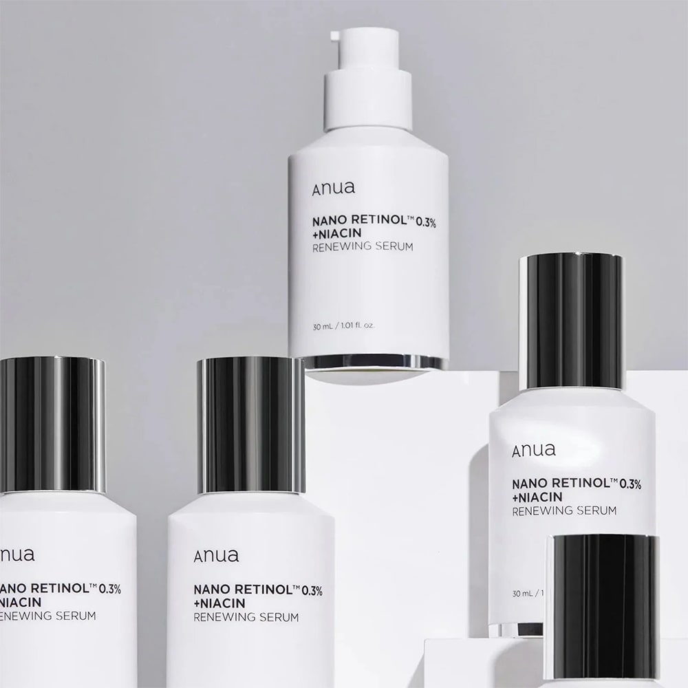 The Retinol 0.3% + Niacin Renewing Serum by Anua is a powerhouse formula combining 5% niacinamide, 0.3% nano retinol, and 8 peptides to brighten skin, smooth fine lines, and reduce hyperpigmentation.