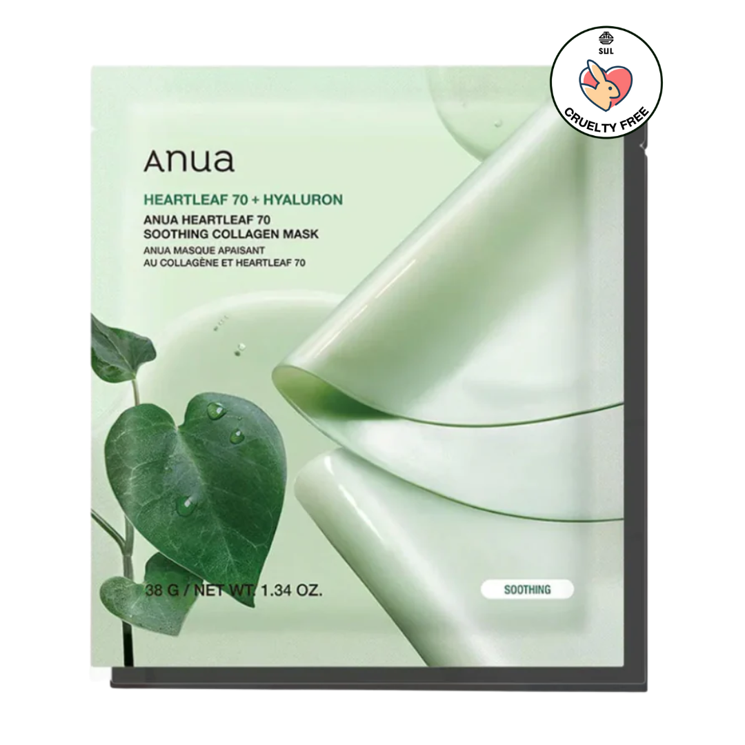 The Heartleaf 70 Soothing Collagen Mask by Anua is a calming hydrogel sheet mask designed to hydrate, soothe, and strengthen sensitive or irritated skin. Infused with 70% heartleaf extract, aloe vera, hyaluronic acid, and low molecular collagen, it helps reduce redness, improve elasticity, and restore a healthy skin barrier. Ideal for all skin types, it delivers long-lasting moisture and a visibly calmer, smoother complexion.