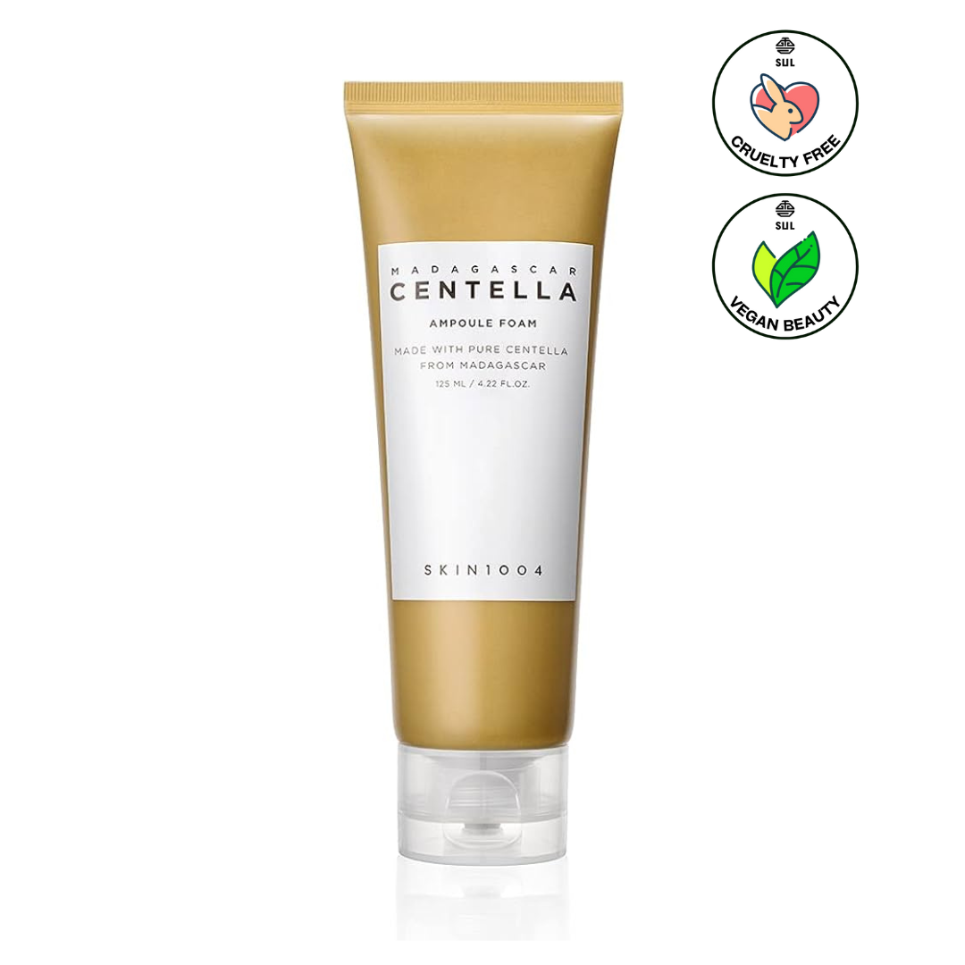 The Madagascar Centella Ampoule Foam by SKIN1004 a rich, foaming cleanser with the ideal pH level of 5 effectively removes makeup and impurities without stripping the skin.