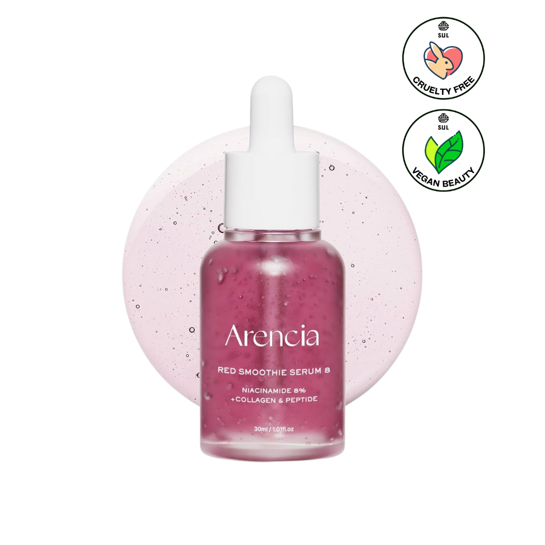 The Fresh Red Smoothie Serum 8 by Arencia is a skin-revitalizing serum designed to minimize pores, smooth wrinkles, and enhance overall skin tone and texture. Formulated with 8% niacinamide, vitamin C-rich rosehip extract, collagen, and peptides, it helps boost elasticity, hydrate deeply, and promote a radiant complexion. Perfect for those seeking a refined, youthful, and healthy glow.