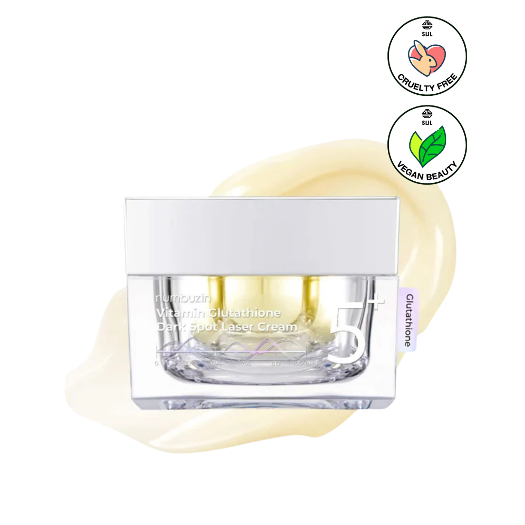 The No.5+ Vitamin Glutathione Dark Spot Laser by Numbuzin is a powerful brightening moisturizer that targets dark spots and uneven skin tone while repairing and strengthening the skin barrier.