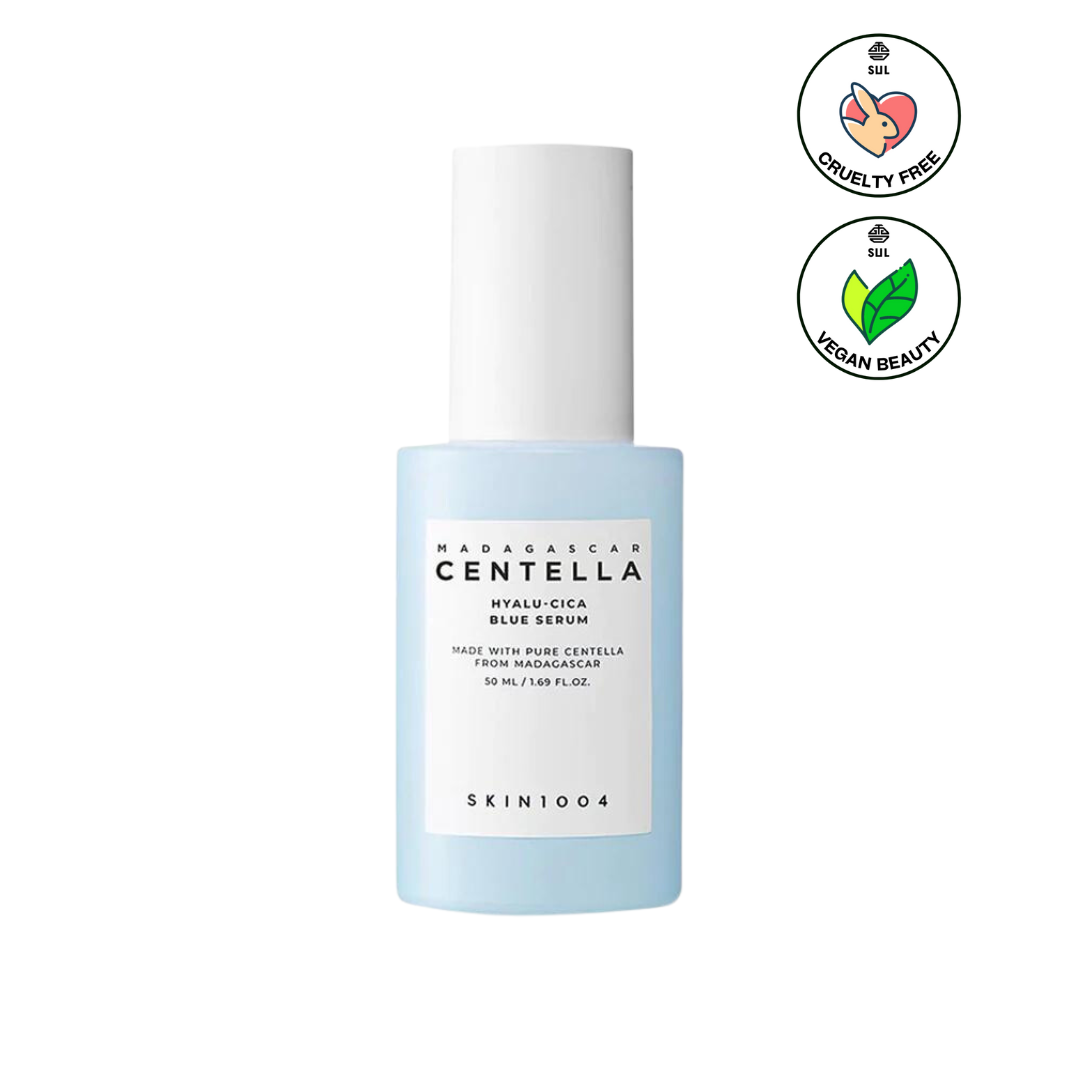 The Madagascar Centella Hyalu-cica Blue Serum by SKIN1004 is a water-gel serum designed to deeply hydrate, brighten, and soothe skin.