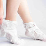 1. After washing your feet, open the pouch and take out foot mask. Wear the socks and seal them up. Wear the sock with “R” sticker on the right and “L” sticker on the left foot (Wrap the mask tightly around the ankles.)