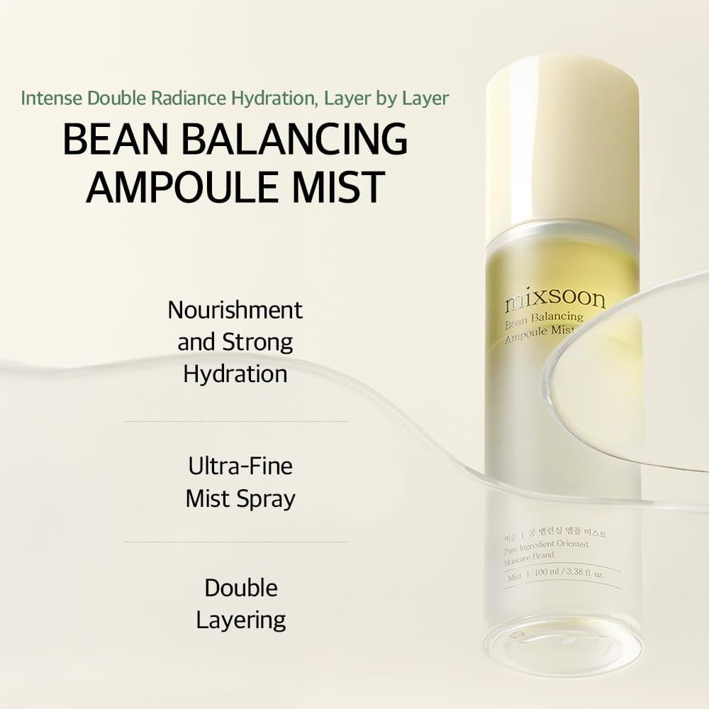 The Bean Balancing Ampoule Mist by Mixsoon delivers instant hydration and a dewy, glass-skin glow with its unique dual-layer formula.